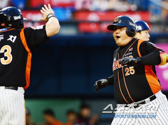 시리즈 전적 1승 1패로 맞서고 있는 두산과 롯데가 위닝 시리즈를 위해 12일 잠실에서 만났다. 롯데 최준석이 2대4로 뒤지던 9회초 2사 1루에서 극적인 동점 투런 홈런을 치고 아두치와 하이파이브를 하고 있다. 잠실=조병관기자 rainmaker@sportschosun.com/2016.06.12/