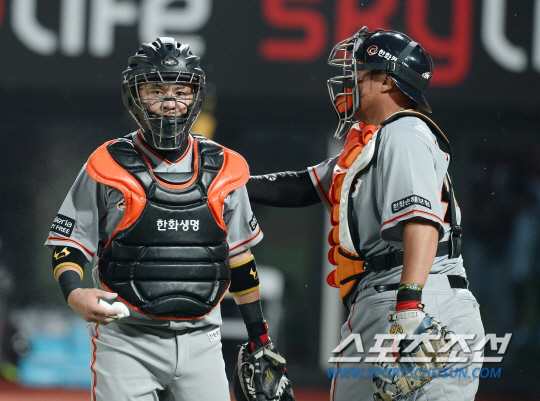 ◇한화 포수 차일목(왼쪽)과 조인성. 18일 청주 넥센전에서 나란히 약속이나 한듯 실책성 플레이를 쏟아냈다. 한화는 6대11로 역전패 당하며 탈꼴찌에 실패했다. 최문영 기자 deer@sportschosun.com /2016.06.14/