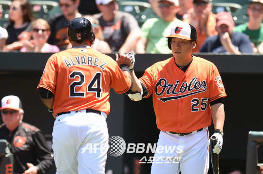 ◇볼티모어 김현수가 26일 탬파베이와의 더블헤더 1차전에서 2회 득점에 성공한 페드로 알바레즈를 대기타석에서 맞아주고 있다. Mitchell Layton/Getty Images/AFP ⓒAFPBBNews = News1