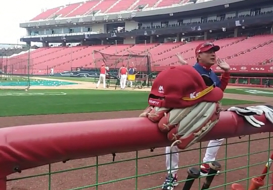 '꽃게를 연상시키는 훈련이 회자됐다'고 하자 김 감독은 "의미없이 재미있는 동작이 아니라 선수에게 도움이 되는 훈련이다"고 했다. 김 감독은 "그 장면이 어떻게 카메라에 담겨는지 모르겠다"며 웃었다.