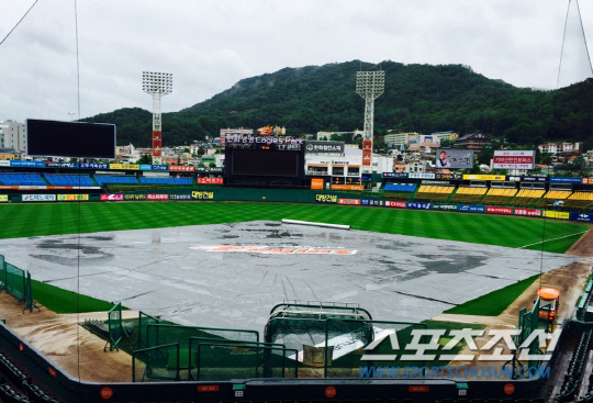 이날 대전 지역에는 오전부터 거센 빗줄기가 이어졌다. 한화 구단은 일찌감치 대형 방수포로 내야 전체를 덮어 비가 그쳤을 때 신속해 그라운드를 정비할 준비를 했다. 그러나 비는 그치지 않았다. 중부 지역에는 주말 내내 비예보가 있다. 이날도 밤까지 비가 이어질 것이라는 관측이 나왔다.