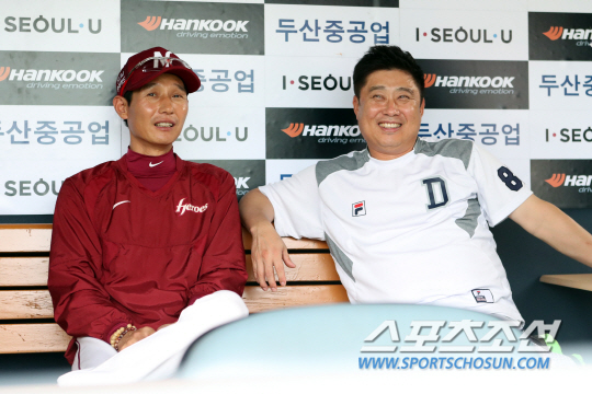 그러자 염 감독이 한 마디 툭 던졌다. "두산이 선발 로테이션을 다 짜놨더라. (12~14일) NC와의 3연전은 물론 144경기 끝날 때까지 다 정해진 것 같다"고 말했다. 농담도 이어졌다. "에반스가 살아난 건 우리 때문이다. 고척 경기부터 잘 쳤다"며 "김태형 감독은 우리 팀에 고마워해야 한다"고 했다. 이에 김 감독은 웃기만 할 뿐이었다. "에반스가 그러긴 했지"라고 했다.