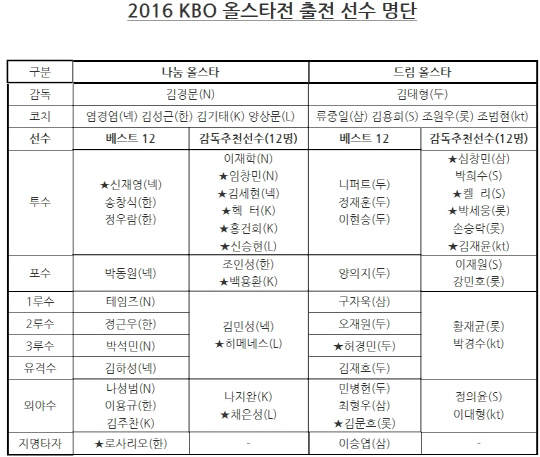KBO가 6일 올스타 베스트12와 함께 감독추천 선수를 발표했다. 감독 추천선수는 나눔 올스타(NC 넥센 한화 KIA LG)와 드림 올스타(두산 삼성 SK 롯데 kt) 각 12명이다. 양 팀은 각각 24명이 경기에 나선다.