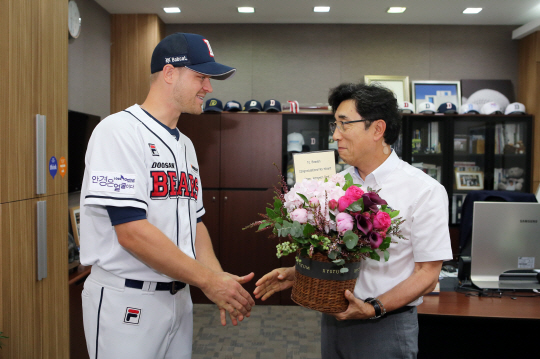 박정원 두산 베어스 구단주가 외국인 투수 마이클 보우덴에게 꽃다발을 선물했다.