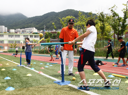 한낮 기온 섭씨 30도가 넘는 무더위 속에서 어린 아이들이 고사리같은 손으로 배트를 잡고 휘두르고 공을 던지고 받는다. 롯데 자이언츠가 사회공헌활동의 일환으로 올해 진행하고 있는 초등학교 야구 아카데미 현장이다. 지난 8일 야구 아카데미가 진행된 부산 구포동 덕천초등학교를 찾아가 봤다. 푸른 잔디가 깔린 운동장에서 40명의 어린이들을 대상으로 롯데의 야구 아카데미 코치, 즉 순회코치 2명이 크게 목소리를 써가며 아이들을 가르치고 있었다. 김민호 코치와 나승현 코치다. 순회코치는 KBO리그에서 롯데 구단이 처음 도입했다.