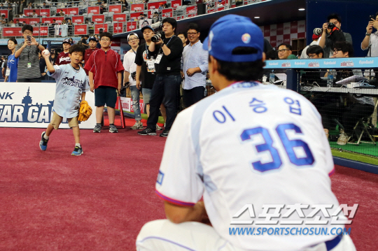 이승엽은 16일 고척 스카이돔에서 열린 2016 KBO 올스타전에서 경기전 한 난치병 어린이와 함께 하는 시간을 가졌다. 급성골수성백혈병을 앓고 있는 홍성욱군(9·죽전초 3학년)이 이승엽을 만난 주인공.
