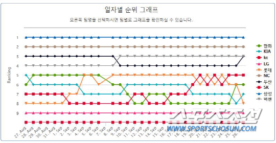 이제 중위권 순위 싸움에 뛰어든 팀이 2개 늘어났다. 창단 첫 최하위를 경험한 삼성에다 잇따른 악재로 분위기 반전이 필요한 kt가 절치부심하고 있다. 19일부터 시작하는 올 후반기. 이래저래 볼거리가 넘쳐날 것 같다. 1년전과 닮은 듯, 다른 듯, 순위 그래프 변화 모습이 궁금하다.