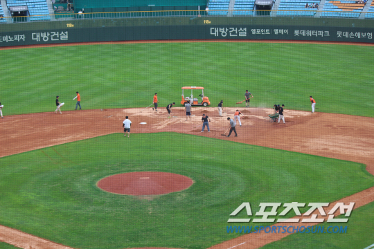 3일 부산 사직구장에서 열릴 예정인 롯데 자이언츠-넥센 히어로즈전이 그라운드 정비 관계로 10분 늦은 오후 6시40분에 시작한다. 이날 낮에 폭우가 쏟아져 그라운드에 물이 가득 찼고, 비가 그친 이후부터 관계자들이 나와 그라운드 정비 작업을 했다. 내야 그라운드의 물을 빼내고 젖은 흙을 걷어내고 새로운 흙을 까는데 시간이 걸려 10분 정도의 시간을 더 주기로 했다.