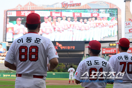 SK는 3일 인천 삼성전에서 실동 아동 5명(이동훈 김도연 김하늘 서희영 이명화)의 이름을 유니폼에 새기고 경기를 치렀다.