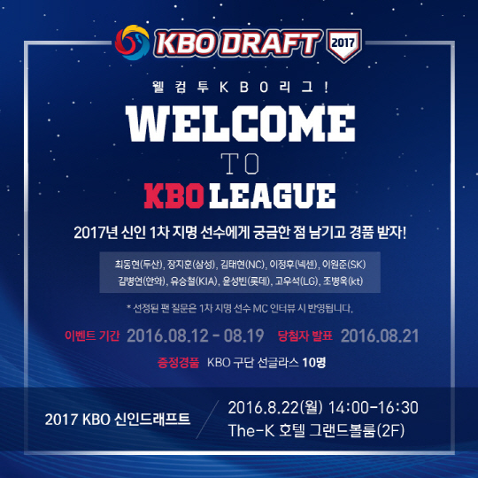 KBO(한국야구위원회)가 12일부터 2017년 KBO 10개구단 신인 1차지명선수에게 팬들이 질문을 하는 '웰컴 투 KBO 리그!' 이벤트를 실시한다.