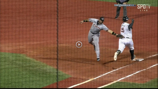 12일 울산 한화-롯데전. 한화가 3-2로 리드한 5회말 롯데 공격. 1사 1,3루에서 최준석이 타석에 들어섰다. 3루 땅볼을 때린 뒤 3루수-2루수-1루수로 이어지는 병살플레이가 시도됐다. 1루주자는 2루에서 포스아웃, 타자 주자가 리그에서 가장 발이 느린 선수로 통하는 최준석임을 감안하면 타구가 약간 느렸어도 충분이 아웃시킬 수있었다. 2루수 정근우의 송구가 약간 빗나갔고, 1루수 로사리오는 왼쪽으로 쏠린 송구를 잡아 달려오는 최준석을 직접 태그하려 팔을 휘저었다. 타이밍상은 아웃. 로사리오가 휘저은 팔이 최준석 몸에 닿았느냐, 안 닿았느냐가 관건이었다. 판정은 세이프였고, 3루주자의 득점은 인정됐다.