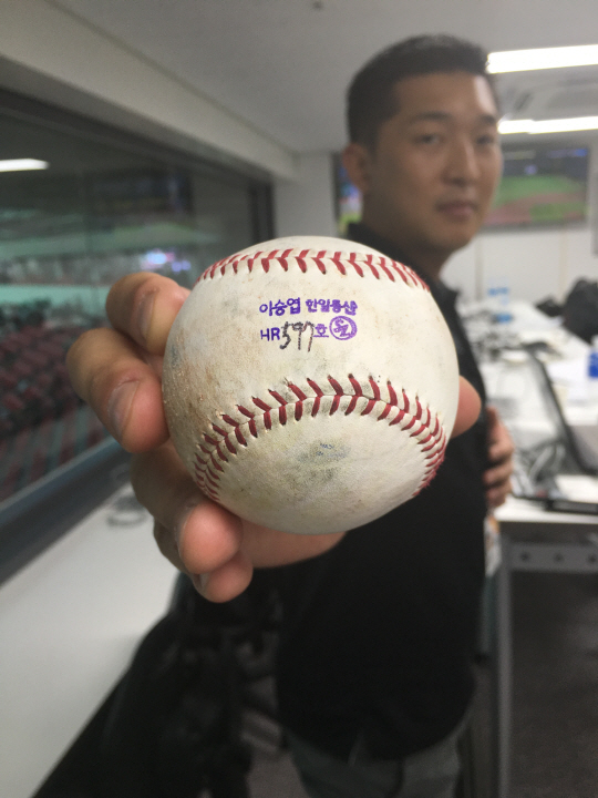삼성 이승엽의 홈런볼이다. 19일 기록한 한일통산 597호 홈런볼. 이승엽의 홈런볼은 595호부터 공식 마크를 한 볼을 사용하고 있다. 이승엽은 한일통산 600홈런에 3개차로 다가섰다. 19일 수원 kt전에서 6-0으로 앞선 2회 상대선발 정대현을 상대로 좌중월 3점홈런을 뽑아냈다. 2사 1,2루에서 초구 바깥쪽 낮은 직구(133㎞)를 통타했다. 밀어친 홈런 비거리는 125m. 전날(18일) 이승엽은 9회 마지막 타석에서 우월 1점홈런(596호)을 터뜨린 바 있다. 2경기 연속홈런이자, 연타석 홈런. 시즌 22호다.