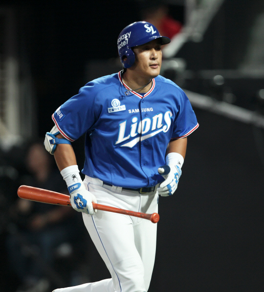 | ◇지난 19일 삼성-kt전. 삼성 이승엽이 2회초 2사 1,2루 때 타석에 들어서 kt 정대현의 초구를 통타 한일 통산 597호 홈런인 중월 스리런홈런을 터뜨린뒤 배트를 받아들고 덕아웃으로 향하고 있다. 사진 제공=삼성 라이온즈 |