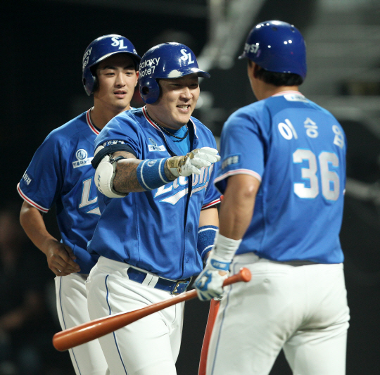 | ◇지난 18일 kt전. 삼성 최형우가 9회초 2사 1루에서 사이클링 히트를 달성하는 좌월 투런홈런을 치고 홈인하며 이승엽의 환영을 받고 있다. 이승엽은 곧이어 연속타자홈런을 기록했다. 사진 제공=삼성 라이온즈 |