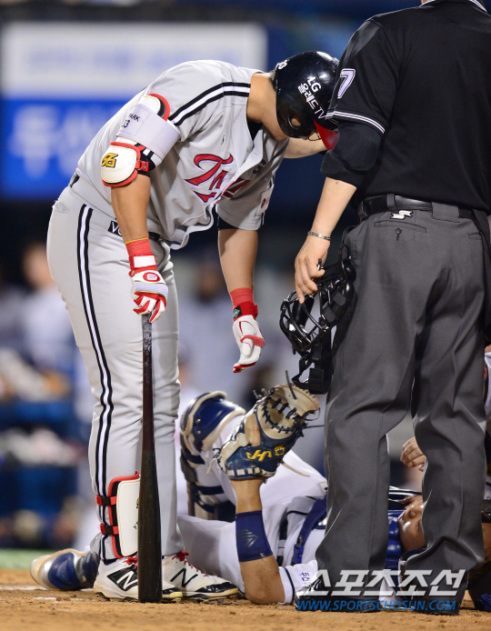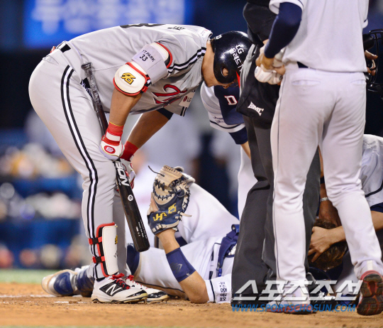 양의지는 팀이 8-1로 앞선 3회초 수비에서 1사후 박용택의 헛스윙 삼진때 뒤에서 돌아 들어온 방망이에 머리를 맞았다. 박용택이 헛스윙을 하다가 왼손을 놓으면서 배트가 크게 원을 그렸다. 양의지는 쓰러진 채 고통을 호소했고, 그라운드로 구급차가 들어와 이송했다. 두산 코칭스태프, 박용택 등이 걱정스런 표정으로 홈플레이트 주변을 지켰고, 팬들은 "양의지!"를 연호했다. 양의지는 박세혁으로 교체됐다. 양의지는 어지럼증을 호소했지만 의식은 뚜렷했다. 강남세브란스병원으로 이송돼 정밀 검진을 받았다. 양의지가 공을 맞은 부위는 머리 우측 앞부분이다.
