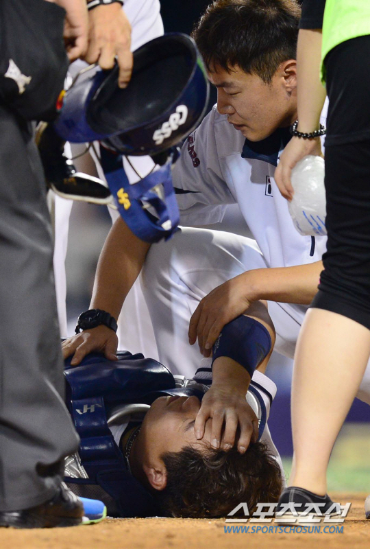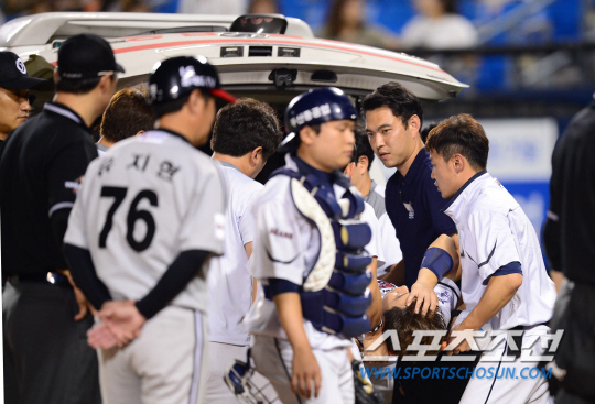 두산 양의지가 24일 LG전에서 타자가 휘두른 방망이에 머리를 강타당해 구급차로 긴급 이송됐다.