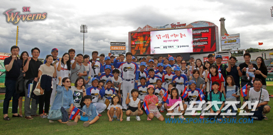 28일 인천 SK-한화전에 앞서 라오스 야구 선수들과 함께 문학 구장을 찾았다.
