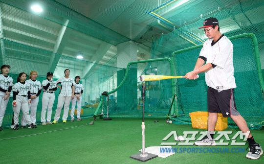 프로야구 LG트윈스 박용택이 28일 서울 잠실야구장 실내 훈련장에서 이화여대 야구 동아리 '플레이 걸스'회원들과 즐거운 시간을 보내고 있다. 스포츠조선이 한국프로스포츠협회와 손잡고 프로스포츠의 대국민 스킨십 캠페인으로 진행하는 '이웃집에 프로가 산다' 프로젝트의 일환으로 박용택이 일일 코치가 되어 야구 동아리 회원들을 만났다. 잠실=최문영 기자 deer@sportschosun.com /2016.08.28/