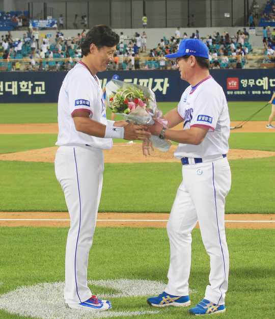 | ◇지난 24일 KBO 통산 최다 1390타점을 기록한 삼성 이승엽이 류중일 감독의 축하를 받고 있다. 사진 제공=삼성 라이온즈 |