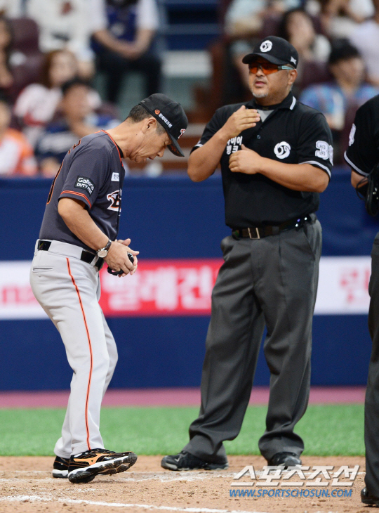 묘한 것은 지난달 비슷한 장면에서 김 감독은 "규정대로 하지 않았다"며 심판진을 강한 목소리로 질타했다. 지난달 7일 대전 NC-한화전에서 홈충돌 방지법과 관련된 합의판정때 NC 김경문 감독이 어필했으나 심판진은 역시 퇴장명령을 내리지 않았다.