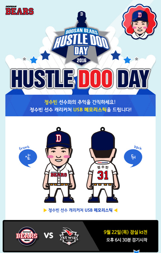 두산베어스가 22일 잠실 kt위즈전에 '허슬두데이(Hustle Doo Day)' 이벤트를 실시한다.