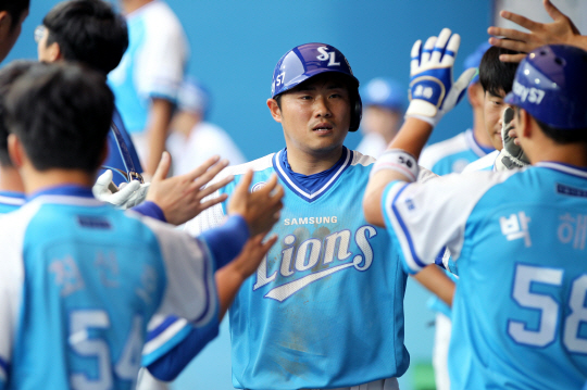 | 11일 오후 대구 삼성 라이온즈파크에서 열린 '2016 프로야구' 삼성 라이온즈 대 NC 다이노스 경기 8회말 1사 2,3루에서 삼성 박해민의 희생플라이로 홈을 밟은 3루주자 이지영이 덕아웃 동료들의 환영을 받고 있다. 사진 제공=삼성 라이온즈 |