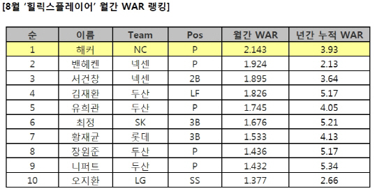 NC 다이노스 에이스 해커가 8월 월간 평균자책점 1.04 짠물 피칭으로 '8월 힐릭스플레이어'로 선정됐다.