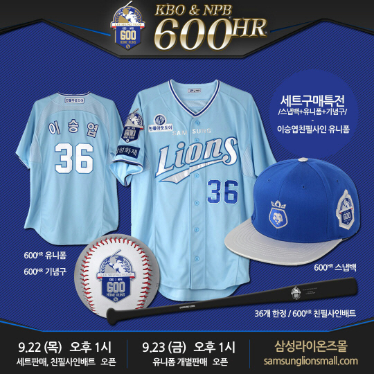이승엽의 한일통산 600홈런 관련 상품이 마련돼 있다. 22일 오후 1시부터 온라인몰을 통해 이승엽의 사인배트 36개를 한정 판매한다. 판매 가격은 50만원. 600홈런 관련 모자, 유니폼 상의, 기념구를 360세트 한정 판매한다. 세트 가격은 22만8000원이다. 모자와 유니폼에는 1부터 360까지의 고유번호 패치가 부착돼 있고, 세트를 구매하는 경우는 이승엽의 친필사인이 담긴 유니폼 상의가 제공된다.