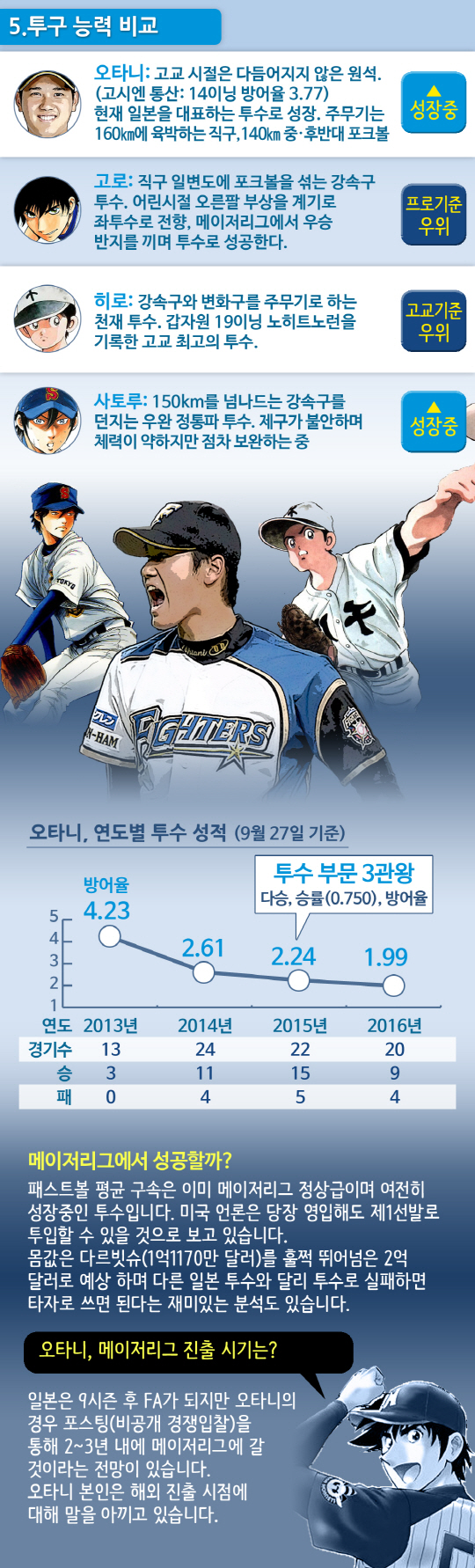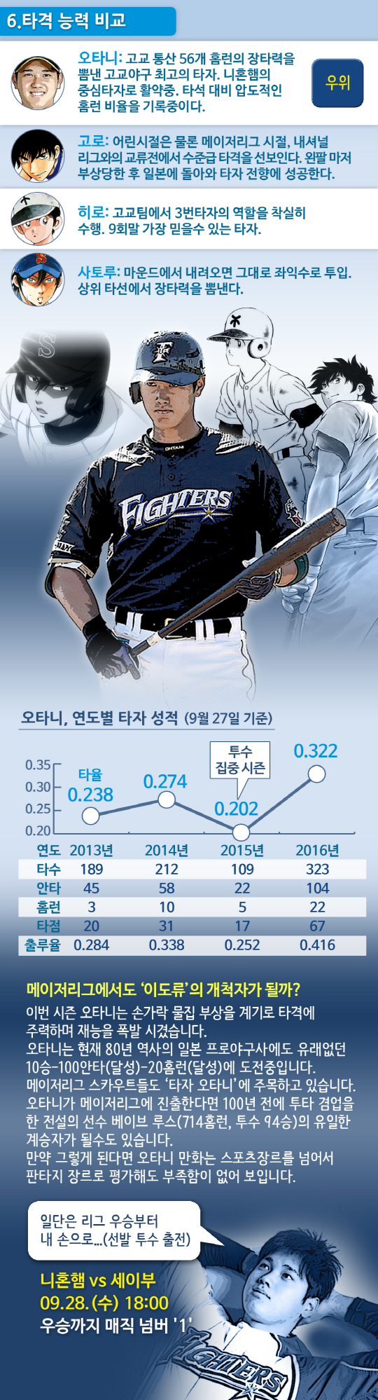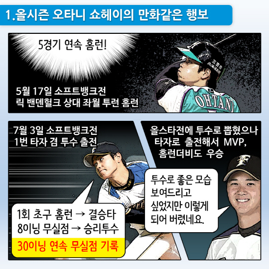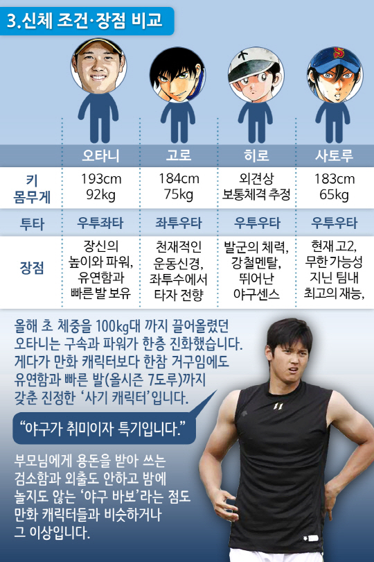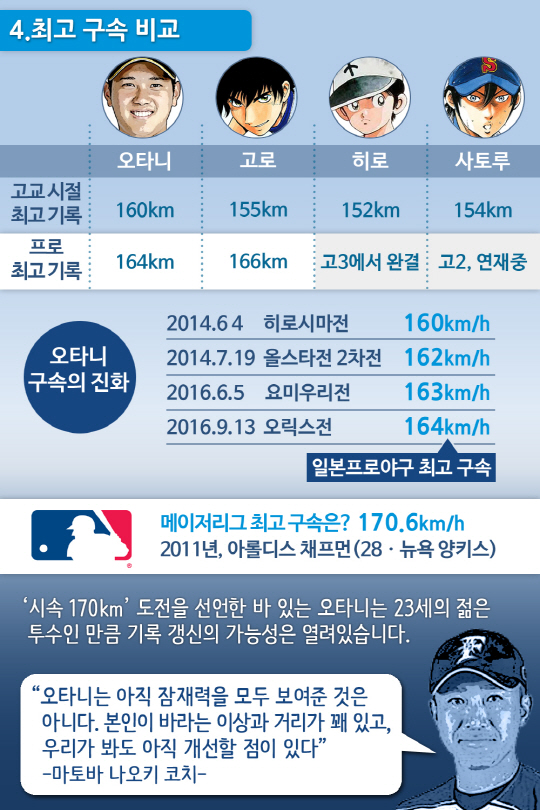 올 시즌 투 타를 겸업하며 최고의 성과를 거두고 있는 일본프로야구의 오타니 쇼헤이(22·니혼햄 파이터스)에게 지겨울 정도로 자주 붙는 수식어가 있습니다. 만화 같은 성적, 만화에서 튀어나온 야구천재, 만화 주인공, 만화 캐릭터 등의 '만화' 관련 수식어입니다. 오타니는 정말로 만화에 등장하는 투 타 만능 캐릭터 못지 않은 능력을 보여주고 있는 걸까요. 아니면 그 이상일까요.