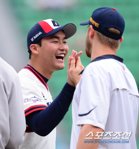 김 감독은 이날 경기전 홍상삼이 앞을 지나가자 박수를 보내며 장난을 걸었다. 홍상삼은 살짝 목례하며 무덤덤하게 취재진과 인터뷰 중이던 김 감독 앞을 지나갔다.