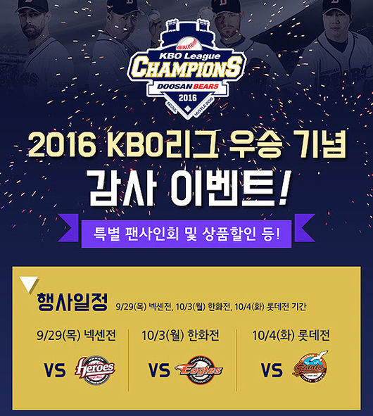 두산 베어스가 잔여 홈경기 기간 KBO 리그 우승 기념 팬 감사 이벤트를 펼친다.