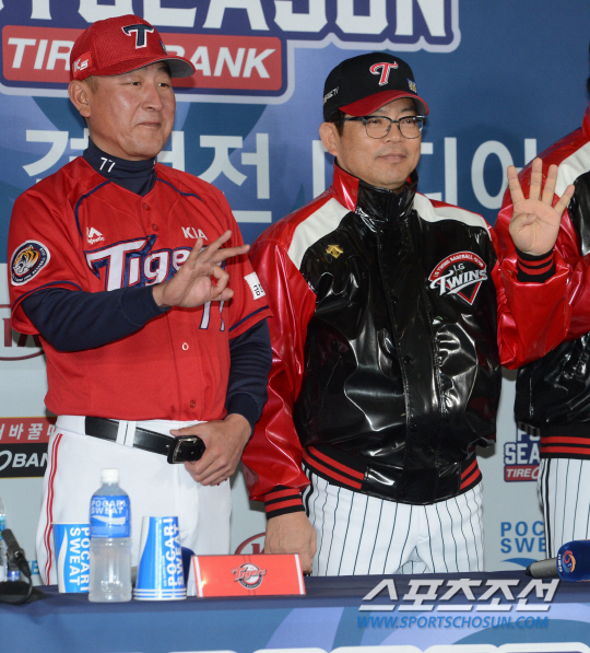 신중한 스타일이 비슷한 양팀 감독. 양 감독은 손가락 4개를, 김 감독은 손가락 3개를 펴들었다. 나름 박빙의 승부를 예상했다. 양 감독은 "경기장 열기, 선수들 부담감 등을 고려할 때 선취점이 중요하다고 생각된다"고 말했다. 김 감독은 "타격전 보다는 수비 실책 등 작은 부분에서 경기가 갈릴 것"이라고 전망했다. 양팀 감독 말을 종합해보면 이기는 팀이 5~6점 정도를 내는 경기 흐름이 될 듯 보인다.