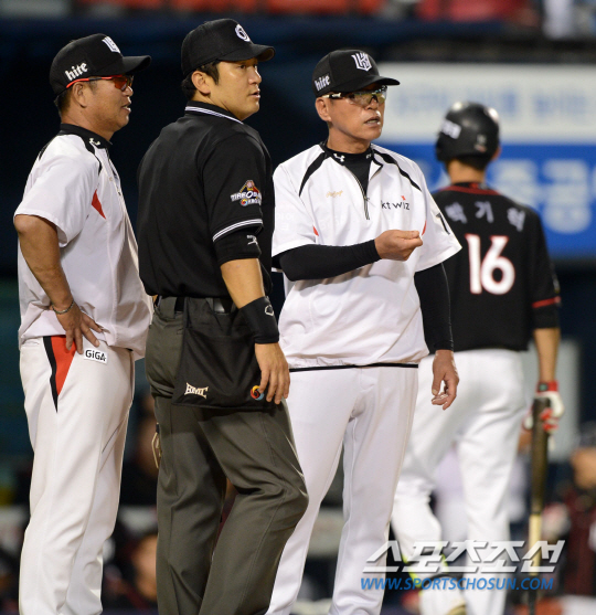두산과 kt의 2016 KBO 리그 경기가 22일 잠실구장에서 열렸다. 6회초 1사 1,2루 kt 박기혁이 두산 장원준의 몸쪽투구를 피하다 배트가 돌아가며 헛스윙 삼진을 당했다. 이에 kt 조범현 감독이 그라운드로 나와 어필을 하고 있다. 잠실=허상욱 기자 wook@sportschosun.com/2016.09.22/