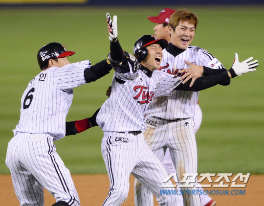KIA 타이거즈와 LG 트윈스의 2016 KBO 와일드카드 결정전 2차전이 11일 잠실구장에서 열렸다. 9회말 1사 만루 LG 김용의가 끝내기 중견수 희생플라이를 치며 엘지가 와일드카드를 차지했다. 김용의가 오지환, 손주인등 선수들과 함께 환호하고 있다. 잠실=정재근 기자 cjg@sportschosun.com/2016.10.11/