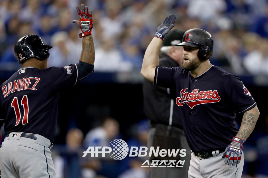 클리블랜드 인디언스 마이크 나폴리가 18일(한국시각) 토론토 블루제이스와의 아메리칸리그 챔피언십시리즈 3차전에서 4회초 솔로홈런을 터뜨리고 홈인, 호세 라미레스와 하이파이브를 하고 있다. ⓒAFPBBNews = News1