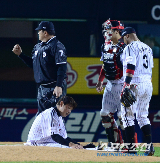 깜짝 놀란 류제국은 곧 툭툭 털고 일어났다. 안타를 때린 김태군도 깜짝 놀라 곧바로 마운드로 향해 류제국을 살폈다. 류제국은 괜찮다는 의미로 김태군의 머리를 툭툭 쳐줬다.