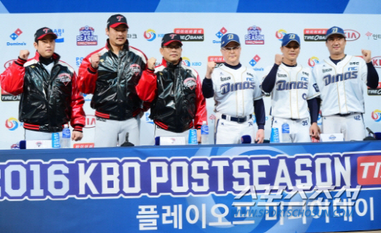 2016 KBO 포스트시즌 LG와 NC의 플레이오프 미디어데이가 20일 창원 마산종합운동장 올림픽기념공연장에서 열렸다. LG 유강남, 이동현, 양상문 감독과 NC 김경문 감독, 이종욱, 김태군(왼쪽부터)이 함께 선전을 다짐하는 화이팅을 외치고 있다. 마산=정재근 기자 cjg@sportschosun.com