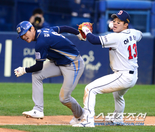 두산 내야수들이 극단적인 전진 수비를 했다. 무조건 홈에서 승부하겠다는 계산이었다. 그리고 결과는 3루수 땅볼. 두산 3루수 허경민이 공을 잡아 주자 김종호를 태그 아웃시켰다. NC 덕아웃 분위기가 차갑게 식은 순간이다.
