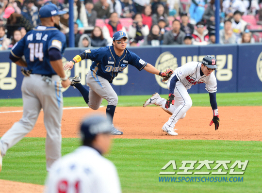 29일 서울 잠실구장에서 열린 두산 베어스와 NC 다이노스의 한국시리즈 1차전. 0-0 동점 상황이던 3회말 두산은 선두 타자 허경민이 좌전 안타를 치고 출루했다. 다음 타자는 김재호. 김재호가 희생 번트를 시도했고, 타구는 안정적으로 굴러갔다. 보내기에 성공하면 상위 타선에서 득점을 노릴 수도 있는 상황.