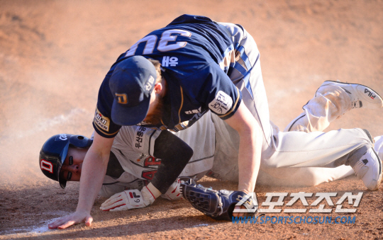 그런데 홈 커버를 들어오던 투수 해커가 포수 김태군의 송구를 받고 착지하는 과정에서 발로 박건우의 무릎 부위를 밟았다. 박건우는 잠시동안 홈플레이트 위에서 크게 통증을 호소하며 일어나지 못했다.