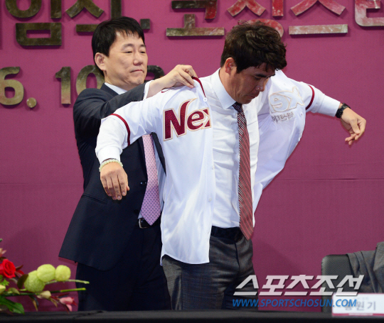 이 대표는 곧이어 장 감독에게 배번 40번이 달린 유니폼과 모자를 씌워주며 정식으로 히어로즈 4대 감독으로 임명을 했다.
