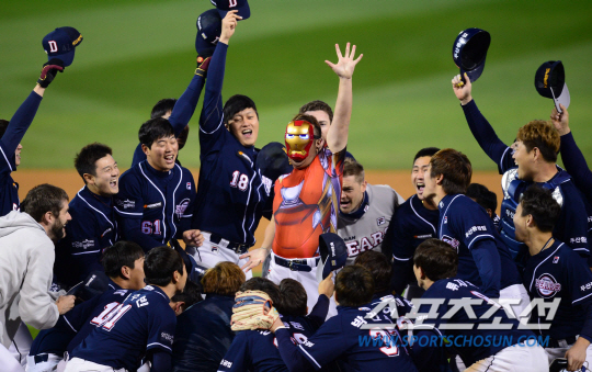 유희관은 우승이 확정된 후 '아이언맨' 가면과 수트를 입고 마운드에 서는 세리머니를 펼쳤다. 유희관은 "제가 준비를 한다고 했다. 말한 것은 지켜야한다고 생각해서 했는데, 마지막에 우승을 하고 오재원, 김재호형이 혼자 우뚝 서라고 포즈를 정해줬다. 9회쯤에 즉흥적으로 만들어낸 장면이었다. 벗는 것보다 여러분 눈의 안정을 위해 좋고, 재미있고 기억에 남는 세리머니 아닌가 싶다"고 말해 웃음을 자아냈다.