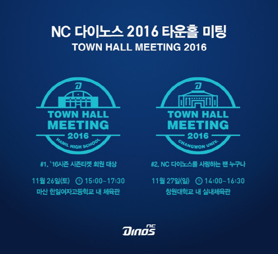 NC 다이노스가 11월 26, 27일 이틀 동안 팬들과 함께 하는 '2016 NC 다이노스 타운홀 미팅'을 연다.