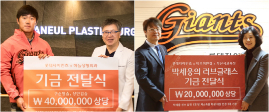 이날 오전 11시 하늘성형외과에서 김성호 원장과 내야수 신본기가 참석한 가운데 소외계층에 대한 의료지원 기금 전달식을 진행했다. 롯데와 하늘성형외과는 지난 6월 의료지원을 통한 사회공헌활동 협약을 맺은 바 있으며, 초록우산어린이재단이 후원하는 아동들을 대상으로 구순열술, 상안검 및 눈썹 하거상술 등 약 4000만원에 해당하는 수술을 지원한다.