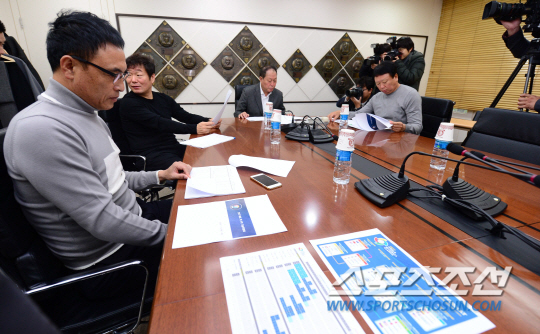 회의 후 김인식 감독이 회의 결과를 발표하고 있다.