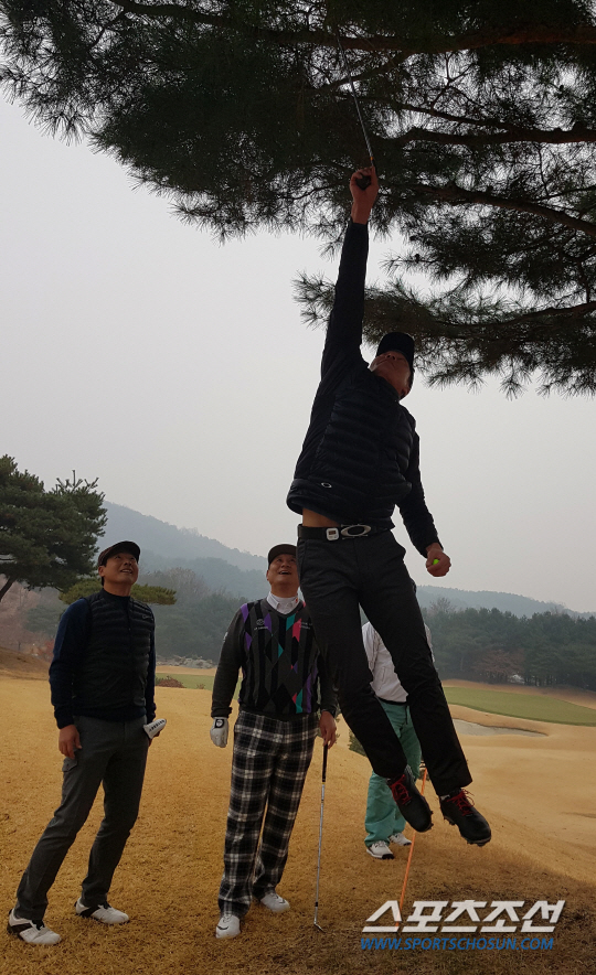 깃대 등을 이용해 빼내려 했지만 솔잎이 많은 곳에 걸려 좀처럼 내려오지 않았다. 1m85의 키가 큰 박승민 코치가 나섰다. 몇차례 점프를 하며 채를 낚아채려 했다. 하지만 역부족. 깃대로 치자 채가 아래로 조금 내려왔고, 다시 박 코치가 점프를 해서 간신히 잡았다.