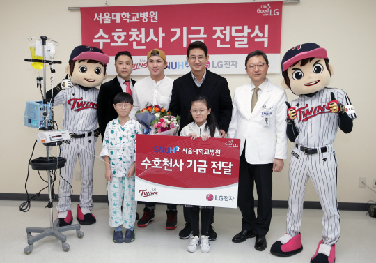 LG는 7일 서울대 어린이병원에서 박용택, 오지환 등이 참석한 가운데 '사랑의 수호천사' 기금 전달식을 개최했다. 이 해사는 LG 트윈스와 LG 전자가 2006년부터 11년째 공동 진행중인 사회 공헌 프로그램이다. 박용택과 오지환이 시즌 중 친 안타 1개당 3만원씩을 적립해 기부하는데, LG 전자도 그 금액만큼 추가로 기부하는 방식이다. 올해는 약 1700여만원이 적립됐다. 이 기금은 난치병 어린이 치료비로 전액 사용된다. LG는 이 기금 뿐 아니라 다양한 용품을 선물로 전달했다.
