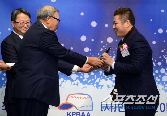한편 이날 '최고의 타자상'은 타격 전 부문에서 고르게 상위에 오르고 출루율(0.475) 1위를 차지한 김태균(한화 이글스)이 받았다. '최고의 투수상'은 평균자책점(3.32) 2위, 다승(15승 6패) 3위를 차지하며 팀을 한국시리즈 2연패로 이끈 장원준(두산 베어스)에게 돌아갔다. '최고의 신인상'은 예상대로 압도적인 투구를 선보이며 시즌 15승을 거둔 신재영(넥센 히어로즈)이 수상의 영예를 안았다.