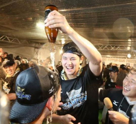 니혼햄 파이터스의 오타니가 재팬시리즈 우승이 결정된 후 축하 세리머니를 하고 있다. 사진캡처=스포츠닛폰 홈페이지