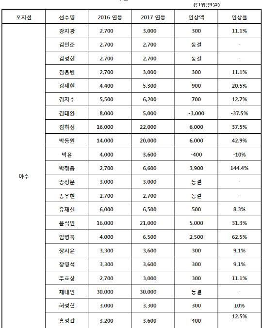 넥센 히어로즈가 야수 22명과 2017시즌 연봉재계약을 했다. 넥센은 올시즌 유격수로서 20홈런-20도루(28도루)를 기록한 김하성과 올해 연봉 1억6000만원에서 6000만원이 인상된 2억2000만원에 연봉재계약을 했다. 올시즌 124경기에 출전하여 타율 2할8푼6리(370타수 106안타) 7홈런 29득점 72타점을 기록한 채태인은 연봉이 동결(올해 3억원)됐다.